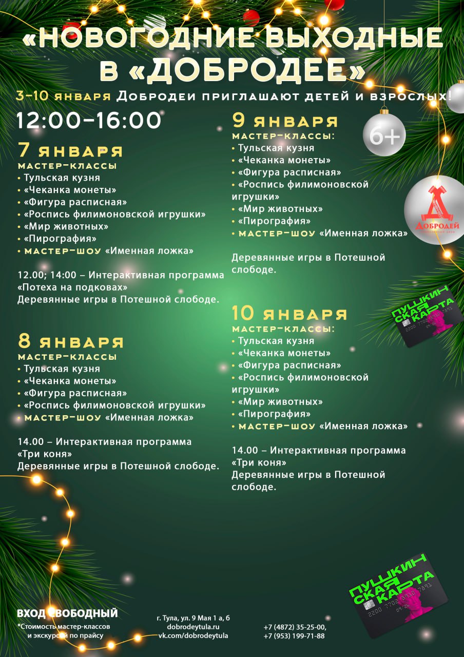 На новогодних каникулах с 3 по 10 января добродеи приглашают детей и взрослых на мастер-классы, интерактивные программы, мастер-шоу и забавы. Мероприятие проводится в рамках регионального проекта «Музейная зима в Туле».