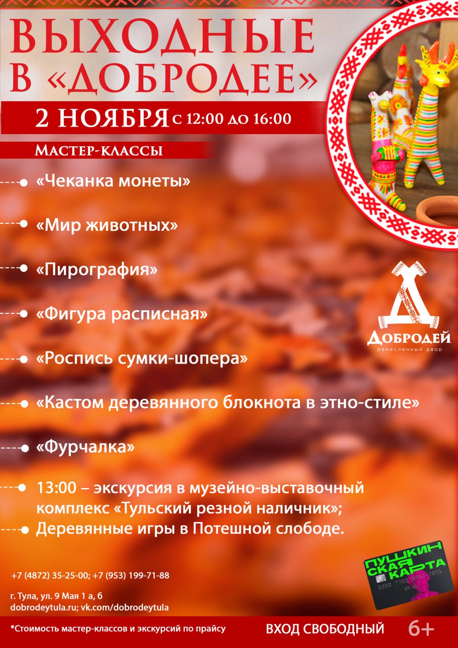 2 ноября добродеи приглашают детей и взрослых на творческие и ремесленные мастер-классы. 3 ноября пройдет «Ночь искусств в ремесленном дворе «Добродей», 4 ноября – заключительные мероприятия фестиваля «Страна в миниатюре».