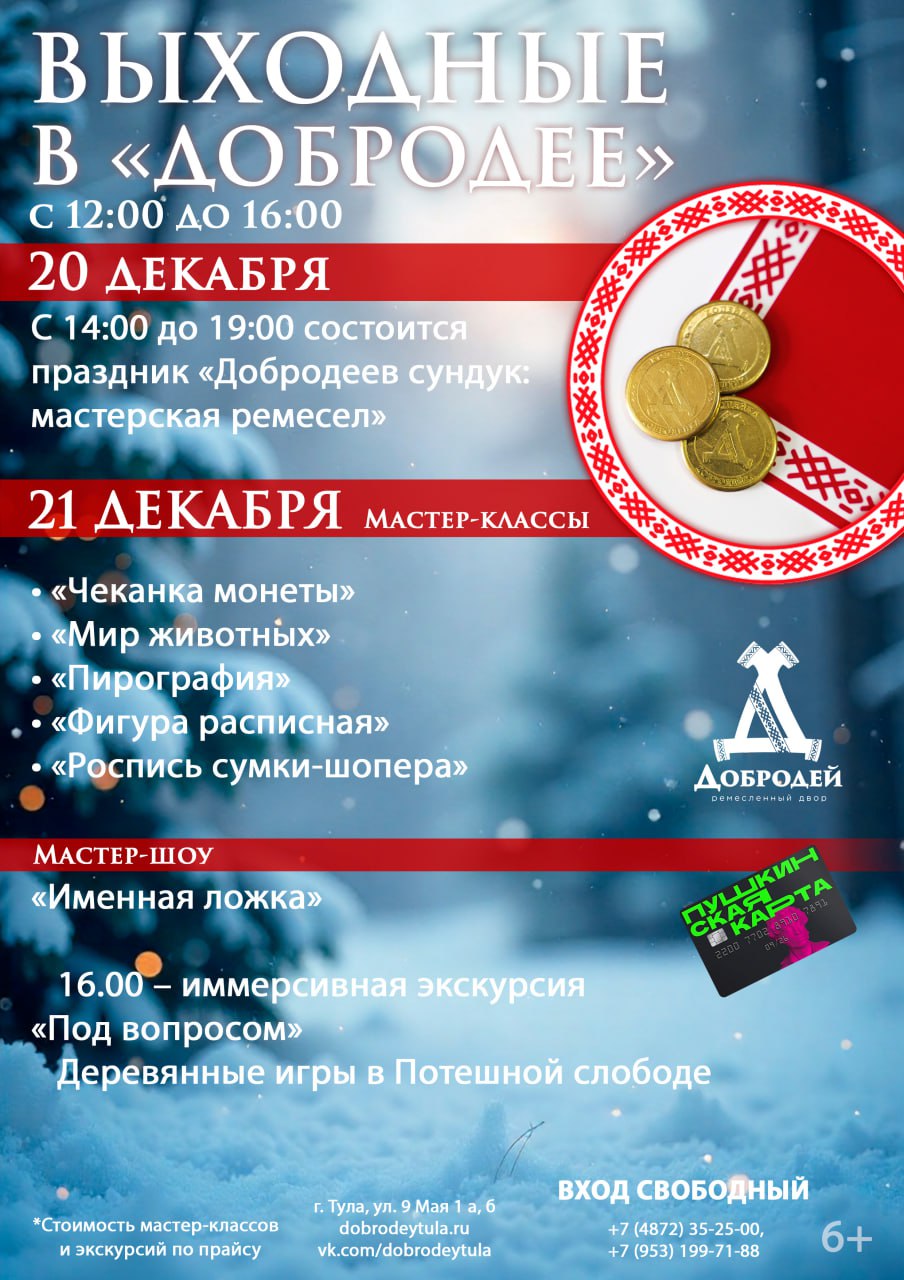 В субботу, 20 декабря, с 14:00 до 19:00 в ремесленном дворе состоится праздник «Добродеев сундук: мастерская ремесел». Событие вошло в программу регионального проекта «Музейная зима в Туле».