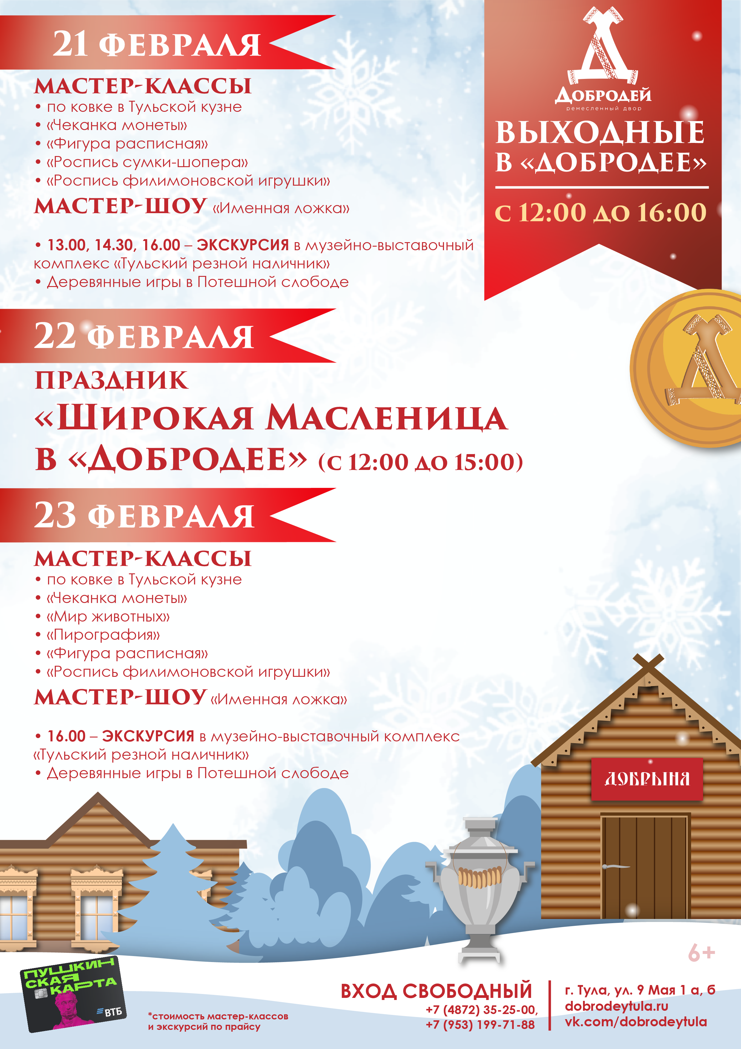 13.00, 14.30, 16.00 – экскурсия в музейно-выставочный комплекс «Тульский резной наличник».