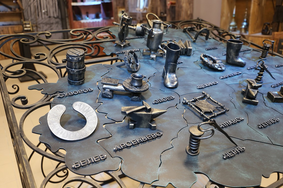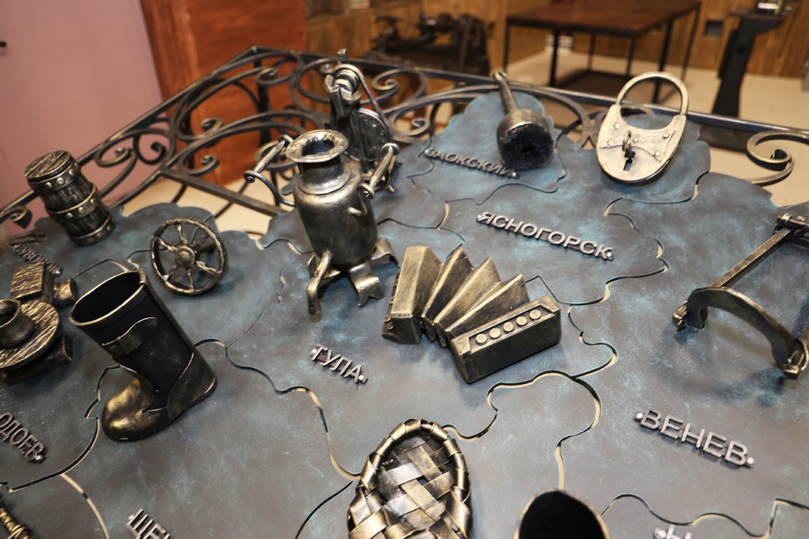 В выставочных витринах вы сможете увидеть «ажурный тульский металл» и предметы, сопровождавшие Тульское чаепитие. Сердце кустарного антимузея - уникальная кованая карта. На ней – символы кустарных промыслов, которые были распространены в каждом из уездов Тульской губернии в начале XX века. Экспозиция подлинных предметов кустарного производства конца XIX – начала XX века