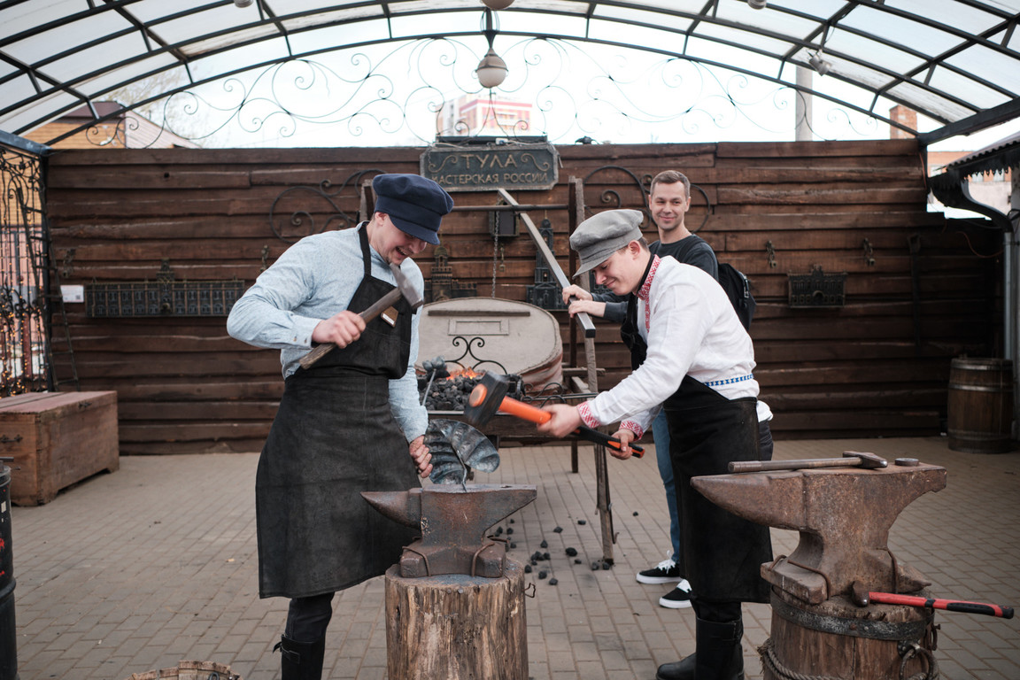 Здесь поселились продолжатели его традиций – кузнецы, чеканщики и граверы. Приходите к ним, чтобы увидеть, как работают мастера, и сами становитесь мастером. Вам расскажут о мужских металлических ремеслах древней Тулы и откроют секреты старинных инструментов. Вы узнаете, почему старинный кузнечный горн называется «Кавалерийский», при помощи каких инструментов создавался самый большой в России цельнокованный нож «Куябрик», увидите, как голосовой помощник Алиса включает свет на «Металлической улице», сможете рассмотреть золотые яблоки и изысканные розы, тульские вензеля и подковы, которые растут на чудо-дереве. Эти удивительные истории и прекрасные образцы творчества лучших тульских ремесленников, украшающих «Тульскую кузню», станут источником вдохновения перед мастер-классами по художественной обработке металла.